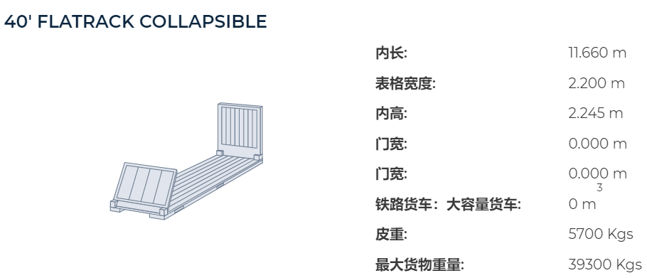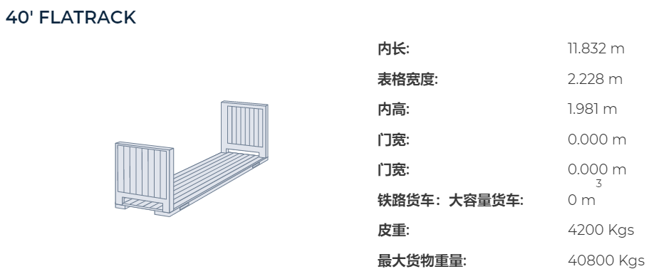 40尺平底貨柜:內容積為 12.05M * 2.12M * 1.96M, 配貨毛重一般為36噸, 體積為50立方米。