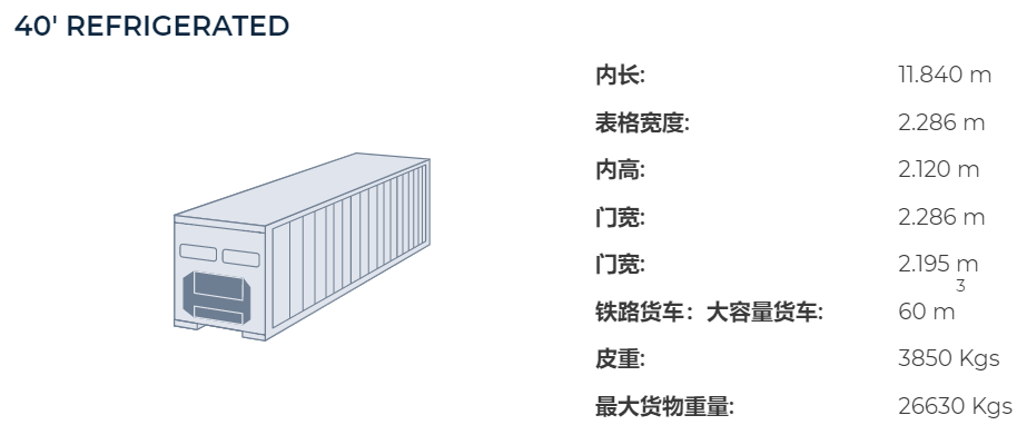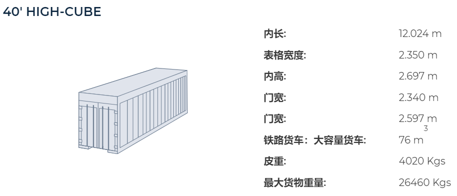 40尺柜: 內容積為 11.8M * 2.13M * 2.18M, 配貨毛重一般為22噸,體積為54立方米。